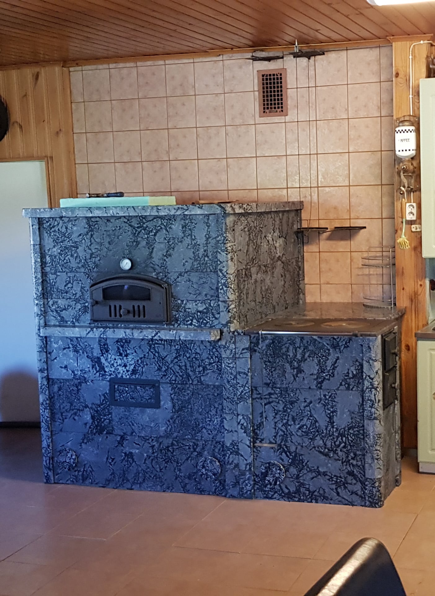 Rustiikki lohkopintainen ja jykevä 6500 kg painoinen uuni on rakennettu Itävaltaan hiihtokeskuksen lähelle. Monikanavainen uuni lämmittää tehokkaasti isonkin hirsirakennuksen.